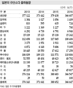 일본은 2016년 4월-2017년 3월 규산소다 생산량이 36만6607톤으로 전년대비 3.0% 감소했으며, 내수와 수출을 포함한 출하량은 36만6647톤으로 4.0% 줄어들었다.
