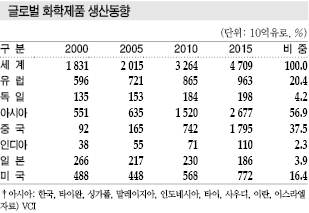 중국은 글로벌 화학제품 생산에서 차지하는 비율이 2000년 5%, 2005년 8%에서 2010년 23%로 급격히 상승했다. 2015년에는 무려 38%로 미국의 2배 이상, 약 20%를 차지한 유럽 전체를 능가하는 화학대국으로 성장했다.