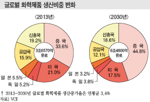 독일 화학공업협회는 글로벌 화학제품 생산에서 중국이 차지하는 비율이 2013년 33.6%에서 2030년 44.8%로 상승할 것으로 전망하고 있다.