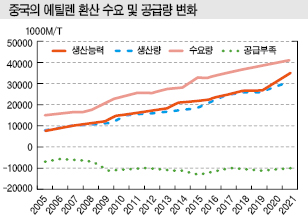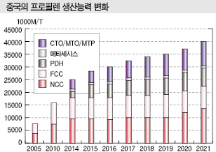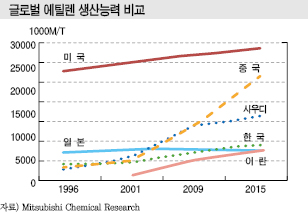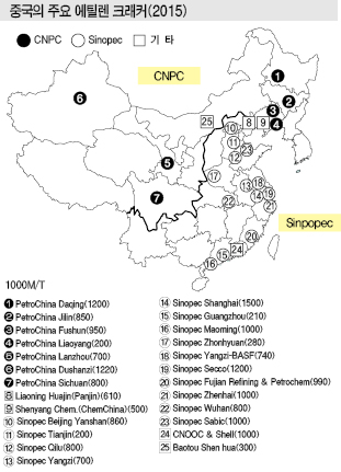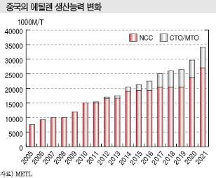중국은 2015년 에틸렌 생산능력이 2500만톤을 상회해 코스트경쟁력이 뛰어난 사우디를 제치고 미국에 이어 글로벌 2위로 도약했다.