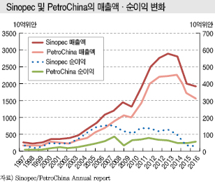 Sinopec은 2016년 매출액 1조9300억위안, 자산 9780억위안, 순이익 590억위안, 순이익률 3.1%를, PetroChina는 매출액 1조6170억위안, 자산 2조3970억위안, 순이익 290억위안, 순이익률 1.8%를 기록했다.