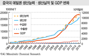중국은 에틸렌(Ethylene) 생산량이 1985-2016년 연평균 11% 증가했으며 앞으로도 높은 신장률을 유지할 것으로 예상되고 있다.