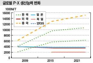 P-X(Para-Xylene) 역시 세계 1위로 중국 생산능력의 70%에 상당하는 한국이 2위, 인디아가 3위, 미국이 5위로 뒤따르고 있다.