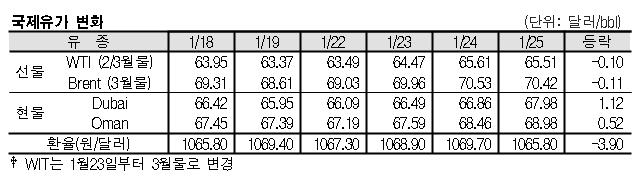 1월25일 국제유가는 미국 달러화 강세, 미국의 원유 생산량 증가 전망 등으로 하락했다. 1월25일 국제유가는 미국 달러화가 강세를 나타낸 영향으로 하락했다. 표, 그래프: <국제유가 변화> <화학저널 2018/01/26> |