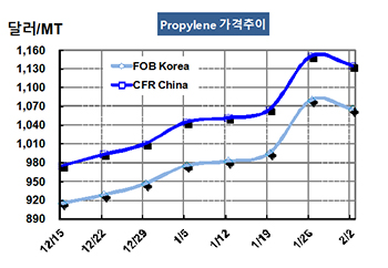 프로필렌(Propylene)은 오랜만에 하락세로 전환됐다. 프로필렌 시세는 2월2일 FOB Korea 톤당 1065달러로 15달러 하락했고 CFR SE Asia는 1015달러로 15달러 떨어졌다. CFR China 역시 1135달러로 15달러 하락했고, CFR Taiwan은 1130달러로 20달러 떨어졌다. 표, 그래프: <Propylene 가격추이> <화학저널 2018/02/06> |
