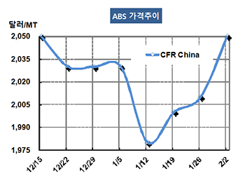 ABS(Acrylonitrile Butadiene Styrene)는 2000달러대에서도 급등했다. ABS 시세는 1월31일 CFR China 톤당 2050달러로 40달러 급등했고 CFR SE Asia 역시 2060달러로 40달러 올랐다. 표, 그래프: <ABS 가격추이> <화학저널 2018/02/07> |