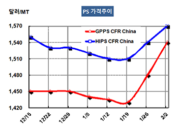 PS(Polystyrene)는 폭등세를 계속했다. GPPS(General Purpose PS) 시세는 1월31일 CFR China 톤당 1540달러로 60달러 폭등했고 CFR SE Asia도 1570달러로 60달러 폭등했다. HIPS(High Impact PS)는 CFR China가 1570달러로 30달러 급등한 반면 CFR SE Asia는 1640달러로 60달러 폭등했다. 표, 그래프: <PS 가격추이> <화학저널 2018/02/07> |