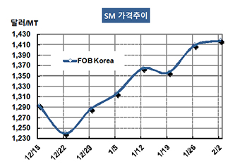 SM(Styrene Monomer)은 상승세가 한풀 꺾였다. SM 시세는 2월2일 FOB Korea 톤당 1417달러로 9달러 상승했고 CFR SE Asia는 1443달러로 8달러 올랐다. CFR India 역시 1456달러로 8달러 상승했다. 표, 그래프: <SM 가격추이> <화학저널 2018/02/07> |