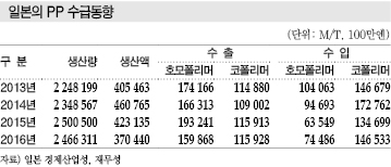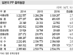 일본 PP 시장은 2016년 내수출하가 238만4048톤으로 2.0% 늘어 3년 연속 증가세를 나타냈으며 수출을 포함한 총 출하량은 253만4376톤으로 평균 가동률이 88% 수준을 나타냈다.