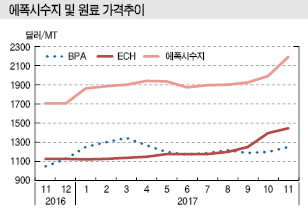 에폭시수지 가격이 2017년 9월 톤당 1900달러 수준에서 11월 2200달러로 급등했으나 ECH도 1250달러에서 1450달러, BPA 역시 1190달러에서 1250달러로 올랐기 때문이다.