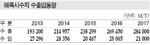 에폭시수지 수출은 2013년 19만3200톤, 2014년 21만4957톤, 2015년 23만8299톤, 2016년 26만9450톤, 2017년 28만톤으로 4년만에 10만톤 가까이 증가했다.