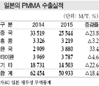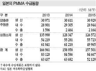 일본은 PMMA 생산량이 2015년 25만2997톤으로 전년대비 1.8% 증가했으나 판매량은 13만3927톤으로 7.8% 줄어들었다. 특히, 자동차용이 주류를 이루고 있는 성형소재 판매량이 9만2887톤으로 10.5% 줄어들며 감소폭이 확대됐다.