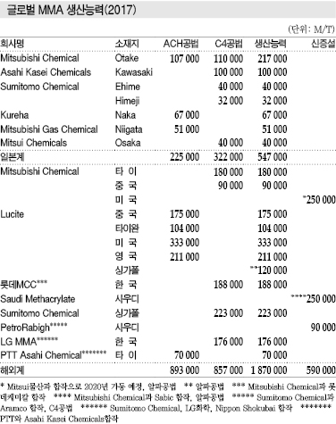 Mitsubishi Chemical과 Sabic의 합작기업 Saudi Methacrylate는 2017년 8월 MMA 25만톤, PMMA 4만톤 플랜트를 상업가동했고, Sumitomo Chemical(SCC)과 아람코(Saudi Aramco)가 합작한 PetroRabigh는 MMA 9만톤, PMMA 5만톤 플랜트를 가을부터 가동한 것으로 알려졌다.