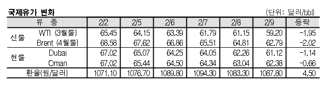 2월9일 국제유가는 미국의 원유 시추리그 수 증가, 이란의 생산능력 확대 계획, 북해 송유관 가동재개 여파, 미국 달러화 강세 등으로 하락했다. 2월9일 국제유가는 미국의 원유 시추리그 수가 증가한 영향으로 하락했다. 표, 그래프: <국제유가 변화> <화학저널 2018/02/12> |
