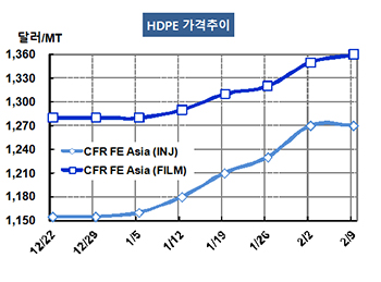 HDPE(High-Density Polyethylene)는 상승세가 멈추지 않고 있다. HDPE 시세는 2월7일 Injection 그레이드가 CFR FE Asia 톤당 1270달러로 변동이 없었고 CFR SE Asia도 1290달러로 보합세를 형성했다. 그러나 Blow-Molding은 FEA가 1360달러, SEA 역시 1380달러로 각각 10달러 상승했다. Yarn 그레이드 역시 FEA가 1320달러, SEA는 1340달러로 각각 20달러 올랐다. 표, 그래프: <HDPE 가격추이> <화학저널 2018/02/12> |