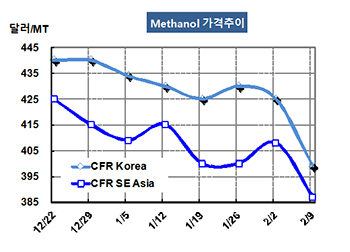 메탄올(Methanol)은 400달러가 무너졌다. 메탄올 시세는 2월9일 CFR Korea 톤당 399달러로 26달러 급락했고 CFR SE Asia는 387달러로 21달러 떨어졌다. 그러나 CFR China는 386달러로 4달러 하락에 그쳤다. 표, 그래프: <Methanol 가격추이> <화학저널 2018/02/12> |