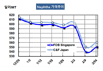 나프타(Naphtha)는 반등에 성공했다. 나프타 시세는 2월16일 CFR Japan 톤당 561달러로 11달러 상승했고 FOB Singapore 역시 550달러로 10달러 올랐다. CIF ARA는 538달러로 3달러 하락했고, FOB US Gulf는 555달러를 형성했다. 표, 그래프: <Naphtha 가격추이> <화학저널 2018/02/23> |