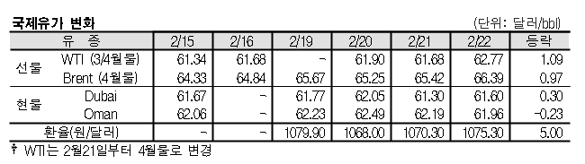 2월22일 국제유가는 미국의 원유 재고 감소, 미국 쿠싱 지역 재고 감소, 미국 달러화 약세 등으로 상승했다. 2월22일 국제유가는 미국의 원유 재고가 감소한 영향으로 상승했다. 표, 그래프: <국제유가 변화> <화학저널 2018/02/23> |