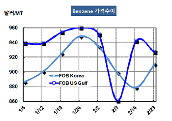 벤젠(Benzene)은 다시 900달러를 넘어섰다. 벤젠 시세는 2월23일 FOB Korea 톤당 910달러로 32달러 상승했고 FOB SE Asia 역시 906달러로 32달러 올랐다. 다만, CFR China는 904달러로 14달러 오르는데 그쳤다. 표, 그래프: <Benzene 가격추이> <화학저널 2018/02/28> |