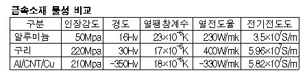 자동차부품 생산기업 DYC가 압출공법 피복재를 개발했다. 표, 그래프: <금속소재 물성 비교> <화학저널 2018/02/28> |