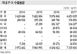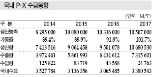 국내 P-X 수요는 2014년 352만7784톤, 2015년 313만6356톤, 2016년 306만5485톤으로 감소세를 나타냈으나 2017년에는 338만톤으로 회복됐다.