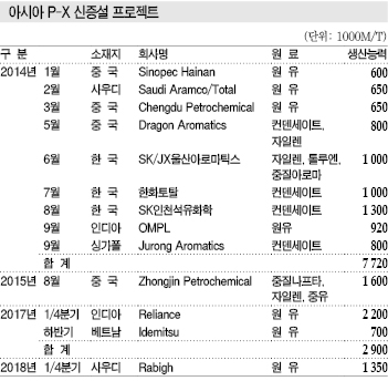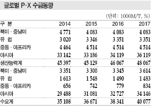 글로벌 P-X 수요는 2016년 3800만톤으로 전년대비 4.6% 증가했고 2017년에도 4.6% 늘어 4000만톤에 근접한 것으로 추정되고 있으나 신증설이 많아 공급과잉 확대가 불가피하기 때문이다.