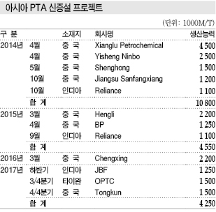 PTA도 다운스트림인 폴리에스터와 마찬가지로 수요가 꾸준히 늘어나고 있으나 최근 공급과잉에 따른 사업환경 악화, 플랜트 폭발사고 등에 따라 중국 전체 생산능력의 20%에 해당하는 1000만톤 이상이 가동을 중단한 것으로 파악되고 있다.