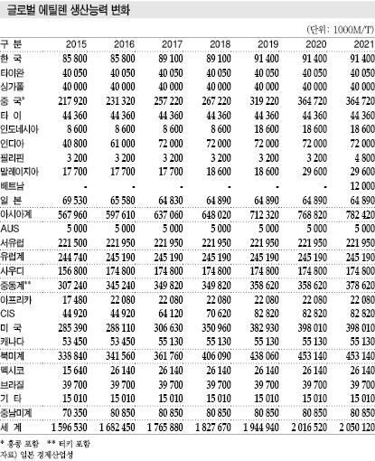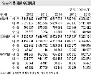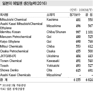 일본은 2016년 에틸렌 생산량이 628만톤으로 전년대비 8.8% 감소했다. 생산능력을 49만3000톤 감축했기 때문이다.
