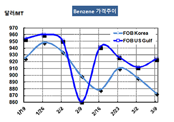 벤젠(Benzene)은 900달러에서 멀어지고 있다. 벤젠 시세는 3월9일 FOB Korea 톤당 873달러로 23달러 하락했고 FOB SE Asia도 868달러로 25달러 떨어졌다. CFR China는 33달러를 하락해 875달러를 형성했다. 표, 그래프: <Benzene 가격추이> <화학저널 2018/03/14> |