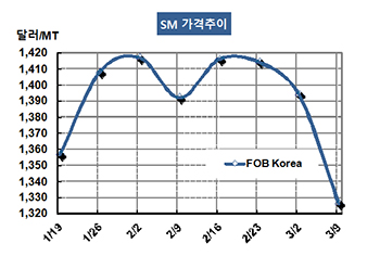SM(Styrene Monomer)은 급락세로 전환됐다. SM 시세는 3월9일 FOB Korea 톤당 1326달러로 48달러 급락했고 FOB SE Asia는 1389달러로 62달러 폭락했다. CFR India 역시 1399달러로 65달러 폭락했다. 표, 그래프: <SM 가격추이> <화학저널 2018/03/14> |