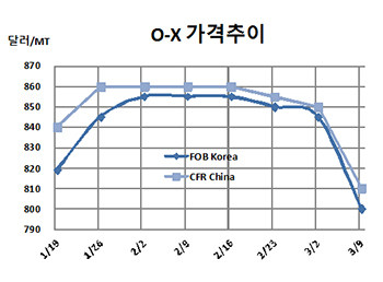 O-X(Ortho-Xylene)는 800달러에 턱걸이했다. O-X 시세는 3월9일 FOB Korea 톤당 800달러로 45달러 폭락했고 CFR SE Asia도 800달러로 40달러 떨어졌다. CFR China 역시 810달러로 40달러 급락했다. 표, 그래프: <O-X 가격추이> <화학저널 2018/03/15> |