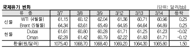 3월14일 국제유가는 미국 휘발유 및 중간유분 재고 감소 등으로 상승했다. 3월14일 국제유가는 미국의 휘발유 및 중간유분 재고 감소로 상승했다. 표, 그래프: <국제유가 변화> <화학저널 2018/03/15> |