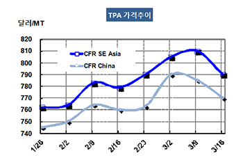 아시아 PTA(Purified Terephthalic Acid) 가격은 중국가격 하락과 정기보수 연기로 떨어졌다. 5월물 거래는 중국 Zhengzhou 거래소에서 가장 활발했으며 38달러 떨어진 5544위안에 거래됐다. 표, 그래프: <TPA 가격추이> <화학저널 2018/03/22> |