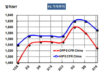 PS(Polystyrene)는 모든 그레이드가 하락랠리를 시작했다. GPPS(General Purpose PS) 시세는 3월14일 CFR China 톤당 1530달러로 50달러 폭락했고 CFR SE Asia도 1560달러로 50달러 떨어졌다. 표, 그래프: <PS 가격추이> <화학저널 2018/03/21> |