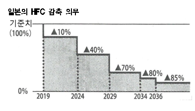 일본은 몬트리올 의정서를 통해 2036년까지 HFC 사용량을 기준치에 비해 85% 가량 감축해야 하며 2019년부터 단계적으로 감축을 실시해야 한다.
