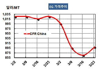 MEG(Monoethylene Glycol)는 다시 900달러에 육박했다. MEG 시세는 3월23일 CFR China 톤당 898달러로 33달러 급등했고 CFR SE Asia도 898달러로 30달러 올랐다. 표, 그래프: <EG 가격추이> <화학저널 2018/03/27> |