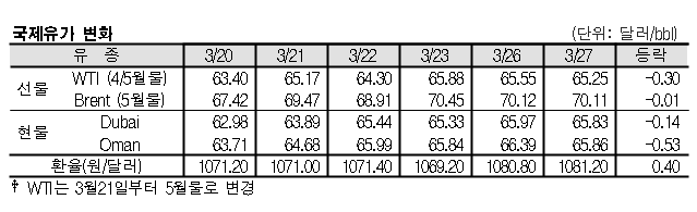 3월27일 국제유가는 미국의 원유 재고 증가 추정, 미국의 원유 생산량 증가 우려, 미국 달러화 강세의 영향으로 하락했다. 3월27일 국제유가는 미국의 원유 재고가 늘어난 것으로 파악됨에 따라 하락했다. 표, 그래프: <국제유가 변화> <화학저널 2018/03/28> |