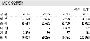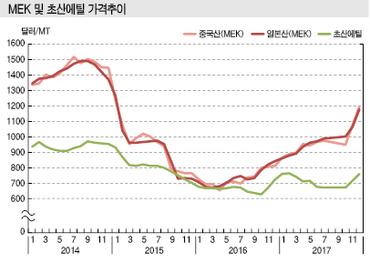 국내기업들은 MEK 가격이 하락함에 따라 2016-2017년 수입량을 늘렸으나 2017년 하반기부터 MEK 강세가 지속돼 수익성 악화가 이어지고 있다.