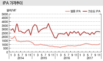국내기업들은 IPA 가격이 급등함에 따라 적자생산을 극복할 수 있었던 것으로 파악되고 있다. IPA와 아세톤(Acetone)의 스프레드는 2017년 초 200달러 미만에 불과했으나 2017년 말에는 400달러에 육박한 것으로 파악되고 있다.