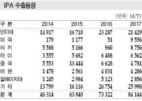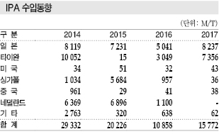 미국 수출은 2017년 이전 연간 1000톤 미만에 불과했으나 2017년 1만톤에 달했고 국내 IPA 총수출도 2015년 6만3840톤, 2016년 7만3322톤에서 2017년에는 8만4144톤에 달한 것으로 집계되고 있다.