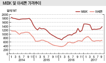 MIBK는 원료인 아세톤과의 스프레드가 2016년 2월 톤당 350달러 수준으로 적자생산이 이어졌으나 2017년 상반기에는 600-700달러로 확대돼 흑자생산으로 전환한 것으로 파악되고 있다. 7-8월에는 스프레드가 600달러대 밑으로 하락했으나 9월 600달러대를 회복해 11월 700달러를 넘어섰다.