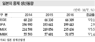 일본은 2016년 MIBK 생산량이 5만1075톤으로 11.3%, 수출량은 2만4542톤으로 21.4% 감소했으며 내수는 2만6801톤으로 0.4% 증가에 그쳤다.