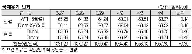 4월4일 국제유가는 글로벌 무역분쟁 우려 등의 영향으로 하락했다. 4월4일 국제유가는 글로벌 무역분쟁이 격화되면서 하락했다. 표, 그래프: <국제유가 변화> <화학저널 2018/04/05> |