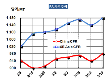 PA(Phthalic Anhydride)는 갑자기 급등했다. PA 시세는 3월30일 CFR China 톤당 980달러로 40달러 급등했고 CFR SE Asia도 1180달러로 40달러 올랐다. 표, 그래프: <PA 가격추이> <화학저널 2018/04/05> |