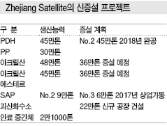 Zhejiang Satellite는 20억위안(약 3400억원)을 투입해 2018년 말 상업가동을 목표로 PDH(Propane Dehydrogenation) 45만톤 플랜트 건설을 추진하고 있으며 C3 체인 확충을 위해 아크릴산 및 아크릴산에스테르 증설, 과산화수소 공장 건설 등을 추진하기로 결정했다.