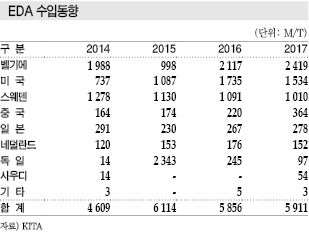 EDA 수입은 2014년 4609톤에서 2015년 6114톤으로 급증했으나 2016년 5856톤으로 감소했고 2017년에는 5911톤으로 변동이 거의 없었다.