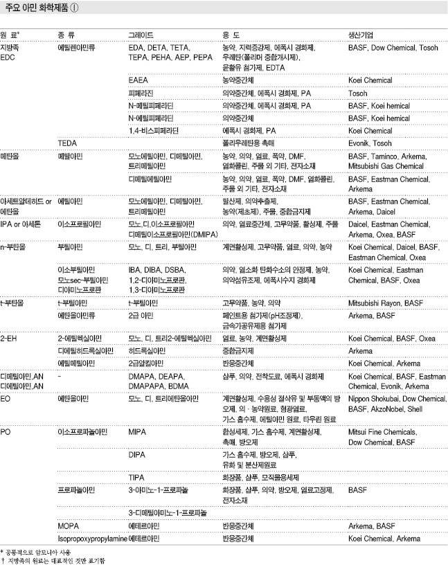 아민(Amine)계 화학제품은 암모니아(Ammonia)를 합성해 생산하는 화학제품으로 원료코스트가 상승하면서 고전하고 있다.