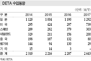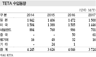 DETA는 2014년 2310톤, 2015년 2216톤, 2016년 2287톤에서 2017년 2643톤으로 15.6% 증가했고, TETA는 2014년 4245톤, 2015년 3626톤, 2016년 4046톤에서 2017년 3724톤으로 감소했다.