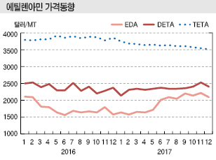 에틸렌아민은 2016년부터 건설 및 조선 경기 침체로 건축 및 선박용 페인트 수요가 감소하면서 에폭시수지 침체가 동반됨에 따라 수요가 소폭 감소했다.