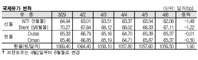4월6일 국제유가는 미국-중국의 무역분쟁 우려 재점화, 리비아의 원유 생산량 증가, 미국의 원유 시추리그 수 증가 등의 영향으로 하락했다.